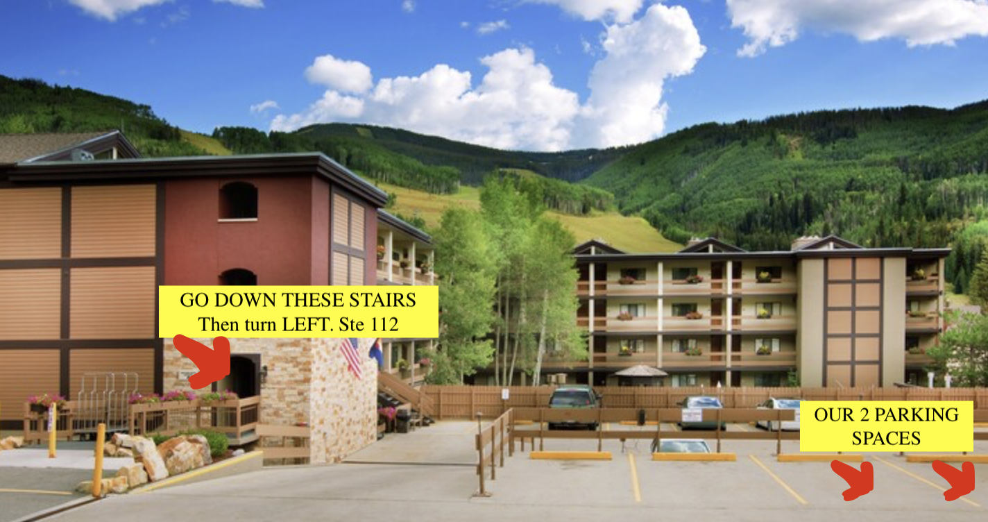 Vail Parking Structure (Park on East side) – a 5-7-minute walk along Frontage Road